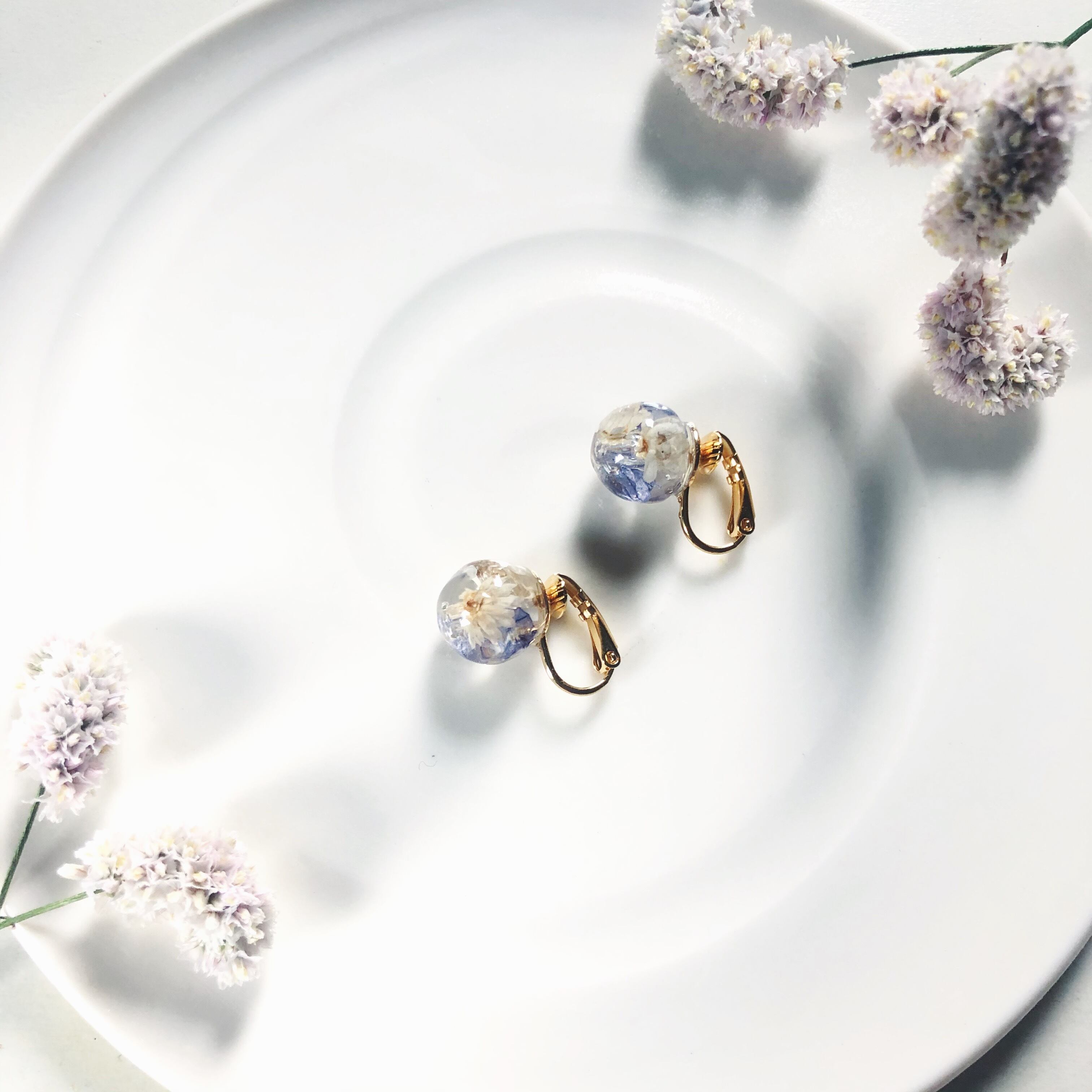 レジンの中にドライフラワーをつめたイヤリングです。ぱっと見はきれいな球体ですが、上から少しレジンを垂らし、表面が水面のように歪んで見えるようにしました。